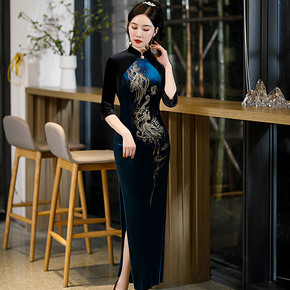 2021新款早秋款改良式复古气质中长款旗袍侧开叉黑...