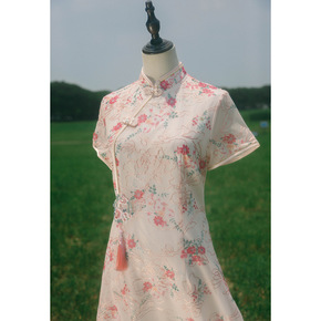 粉色雪纺旗袍改良刺绣中长年轻款碎花少女素雅日常a字...