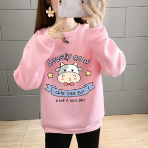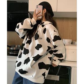胖mm200斤大码女装春秋薄款奶牛印花卫衣外套韩版...