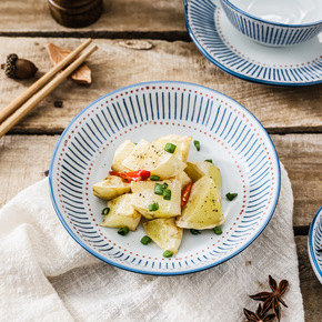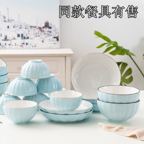 日式蓝和系列陶瓷餐具 家用竖纹碗盘套装盘子吃饭碗组...