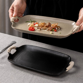 日式餐具网红陶瓷盘子双耳粗陶麻绳盘长方形菜盘复古哑...