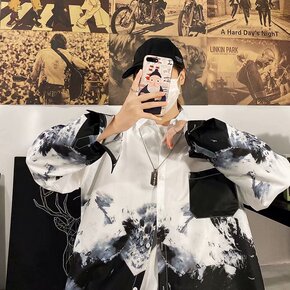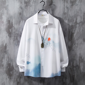 日系花衬衫男港风复古宽松百搭长袖衬衣痞帅韩版潮流休...