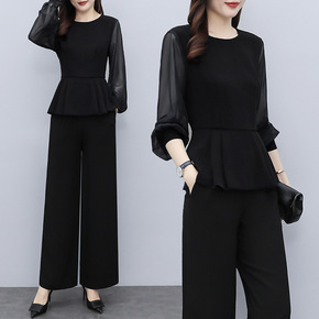 2021春装新款大码时尚套装黑色长袖雪纺衫上衣高腰...
