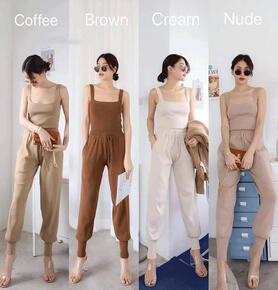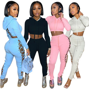 G1035女款跨境 欧美时尚鸡眼绑带纯色裤套装性感...