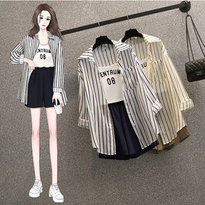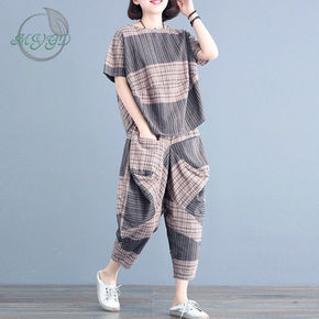 格子套装女夏时尚2022新款韩版大码宽松遮肉洋气七...