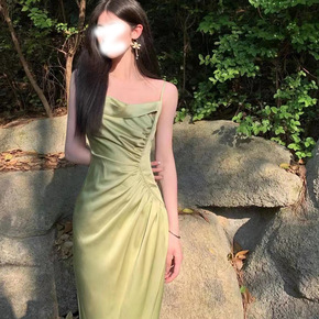 夏季高级感法式设计感纯欲豆绿缎面收腰显瘦不规则时尚...
