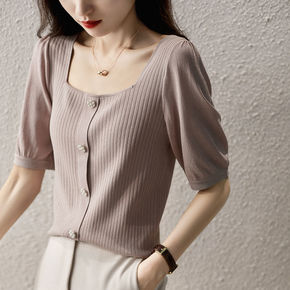 娃娃领冰丝亚麻针织衫欧洲站2022新款欧货泡泡袖小...