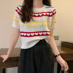 夏季2022年新款复古撞色爱心宽松显瘦短款针织衫女...