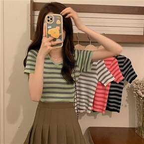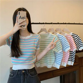 圆领彩条条纹短袖短款针织衫女夏季薄款修身显瘦甜美可...