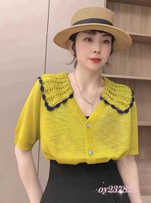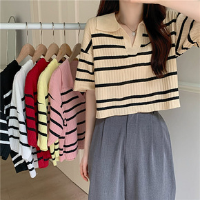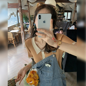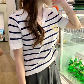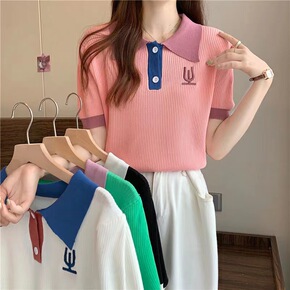 【冰甜酒】夏季轻薄款polo领针织衫女短袖百搭显瘦...