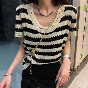 黑白条纹针织衫女2022年夏季新款撞色短袖上衣娃娃...