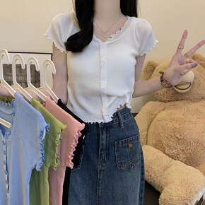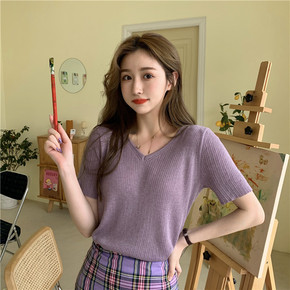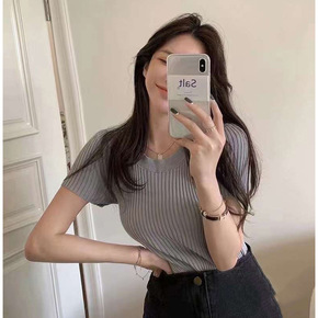 夏季2022新款韩版薄款短袖针织衫短款女复古V领纯...