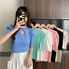 设计感小众镂空上衣女夏季韩版泡泡袖短款修身圆领甜美...