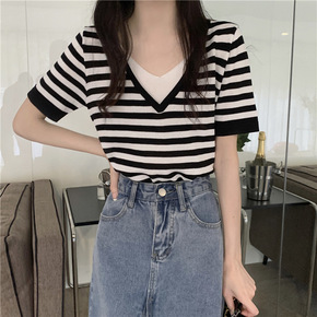 设计感小众短袖针织衫女夏季ins潮条纹新款百搭V领...