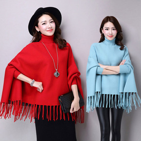 秋冬新款女装韩版宽松针织衫女流苏斗篷披肩套头蝙蝠袖...