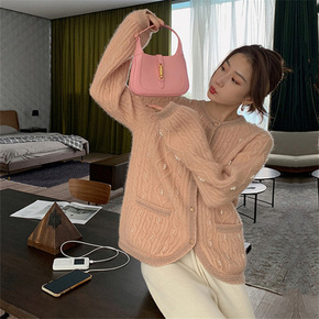 毛衣开衫女秋冬新款小香风绵羊绒加厚软糯圆领钉珠外套...