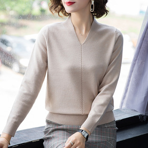 美咋了2018秋冬纯色宽松毛衣女套头V领羊毛针织衫...
