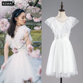 KEMAI柯麦李沁明星同款白色波点夏季新款网纱拼接...