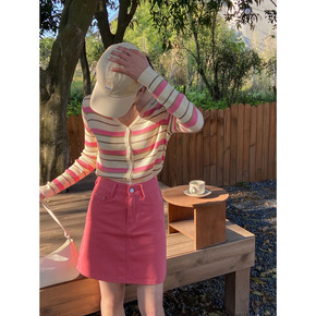 不退不换针织开衫修身外穿女春季条纹撞色v领显瘦长袖...