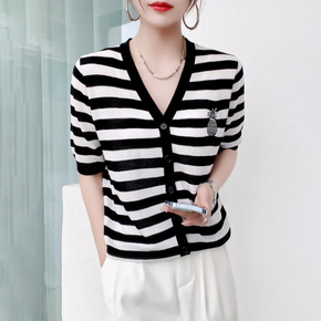 漂亮春夏V领短袖经典条纹针织小开衫胸前菠萝刺绣系扣...