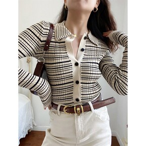 春秋薄款翻领开衫针织外套女法式气质修身内搭条纹设计...
