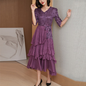 三宅褶皱雪纺拼接连衣裙ins风2021新款时尚修身...