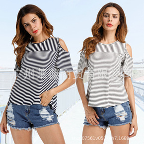 亚马逊2020跨境女装 条纹短袖T恤 外贸圆领露肩...