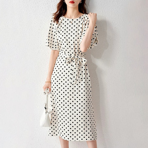 抗皱冰凉丝滑短袖波点连衣裙女气质高级泡泡袖高腰显瘦...