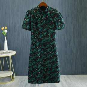 现货 浪漫法式印花连衣裙轻奢手工高定串珠v领长袖中...