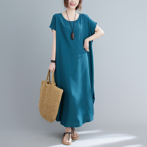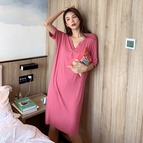 夏季新款V领中袖长款连衣裙韩版螺纹纯色宽松大码舒适...