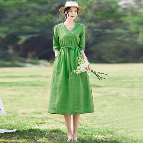 2022春装新款纯色国风复古连衣裙原创绿色系带棉麻...