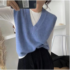 复古蓝色针织马甲女春秋外搭学院风无袖坎肩短款V领毛...