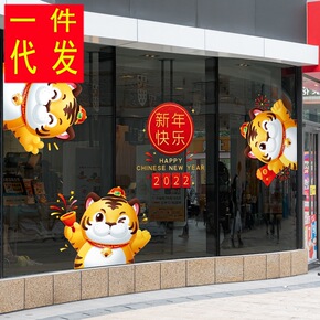 虎年2022服装布置卡通春节奶茶店花贴玻璃窗可爱贴...