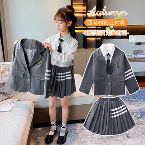 女孩JK制服三件套春秋季女孩长袖洋气西装外套儿童网...