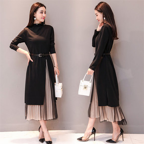 跨境外贸 新款女装长袖开叉打底上衣百褶半身裙时尚套...