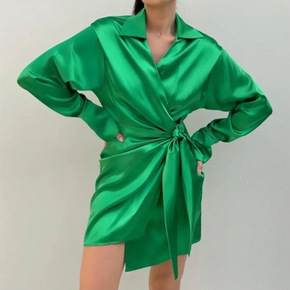 2021欧美女装秋季新款质感修身V领绑带纯色衬衫连...