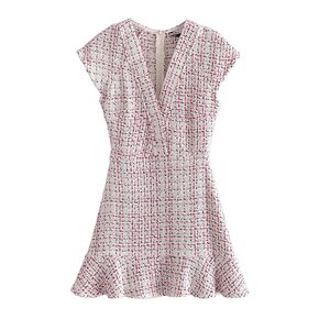 2021秋季新款欧美V领短袖高腰修身荷叶边下摆纹理...