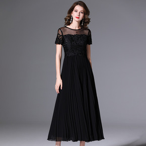 设计感长款连衣裙女2022新款网纱拼接开叉半袖收腰...