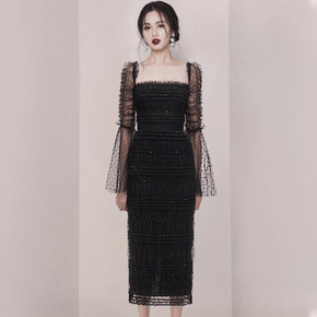 长款刺绣网纱连衣裙2020秋季新款时尚收腰显瘦压褶...