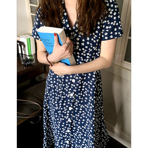 小香盯短袖碎花连衣裙 夏季 法式复古西装领单排扣时...