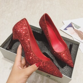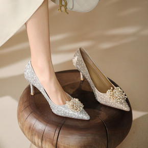 311-2新娘鞋女高跟鞋新娘鞋尖头伴娘细跟亮片夜场...