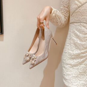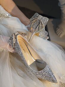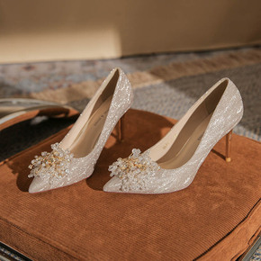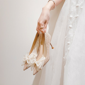 主婚纱婚鞋女细跟2022年新款蝴蝶结亮片面尖头新娘...