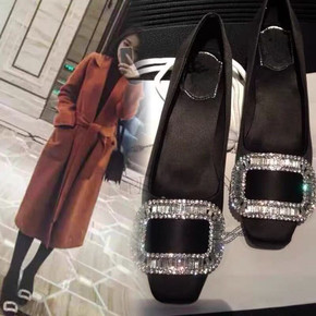 方扣水钻粗跟单鞋女2022秋通勤船鞋中跟方头绸缎平...