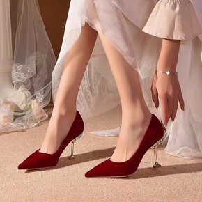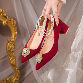 绒面奢华水钻新娘高跟秀禾婚鞋2022女新款红色尖头...