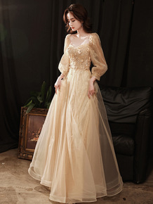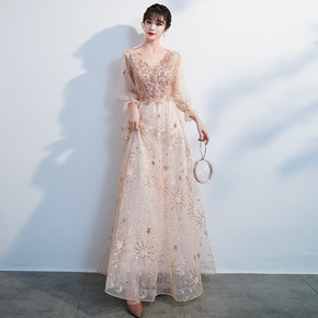 宴会晚礼服香槟色2022春季新款两穿长款气质艺考声...