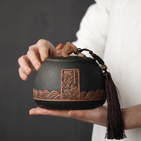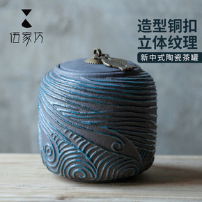 复古粗陶茶叶包装盒 年年有余陶瓷密封存储罐普洱茶叶...