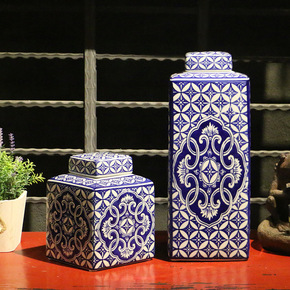 景德镇青花方罐星芒两件套 新中式陶瓷花瓶储物罐家居...