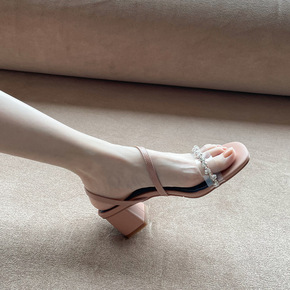 bing水钻一字式仙女风粗跟方头露趾凉鞋新款韩版百...