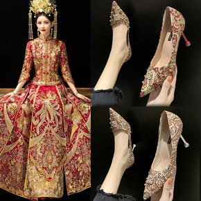 秀禾鞋女新款网红时尚水钻铆钉细跟高跟鞋中式禾服新娘...