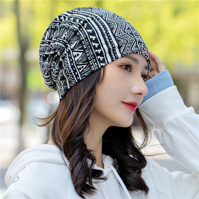 夏季女士薄款棉质户外套头帽 时尚条纹豹纹堆堆帽多功...